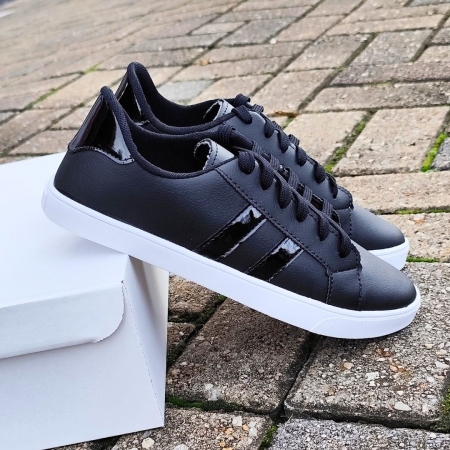 Tenis preto faixa lateral em verniz