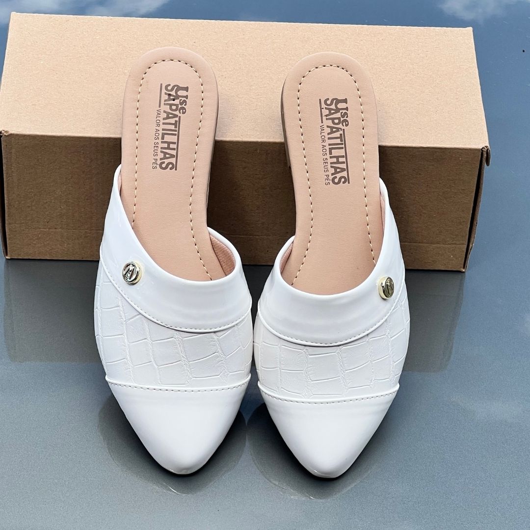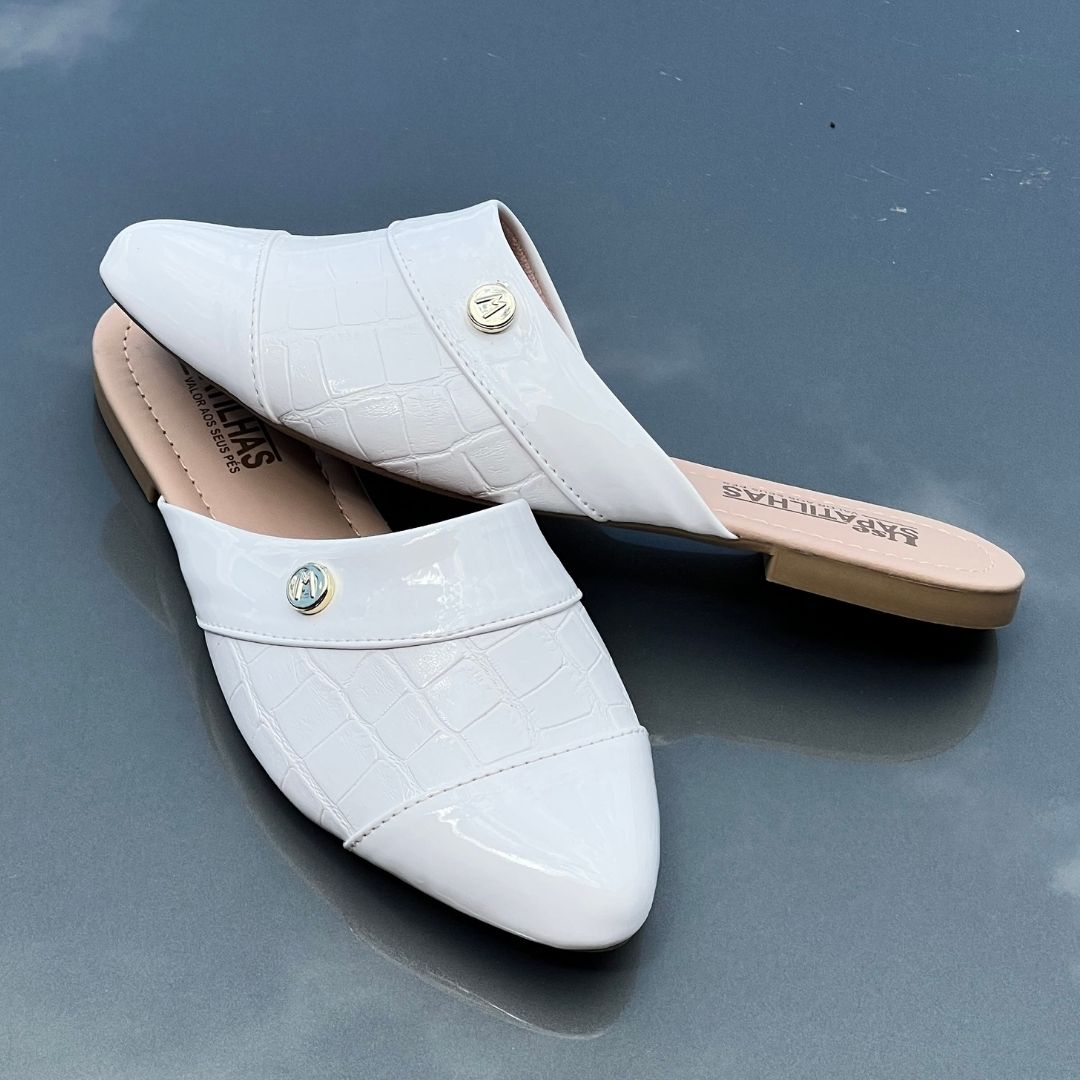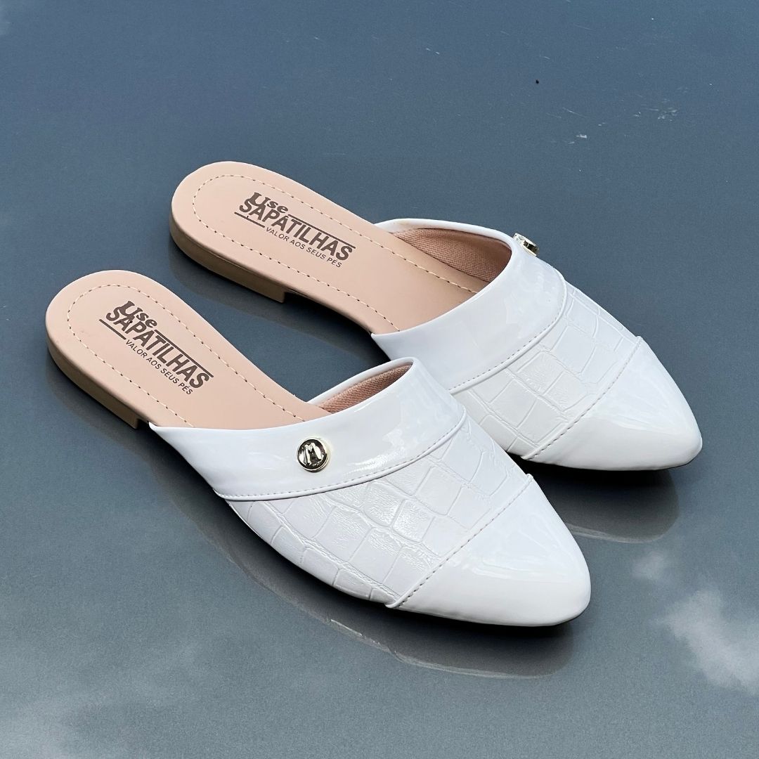 Mule Bico Fino Croco Branco e Verniz Branco