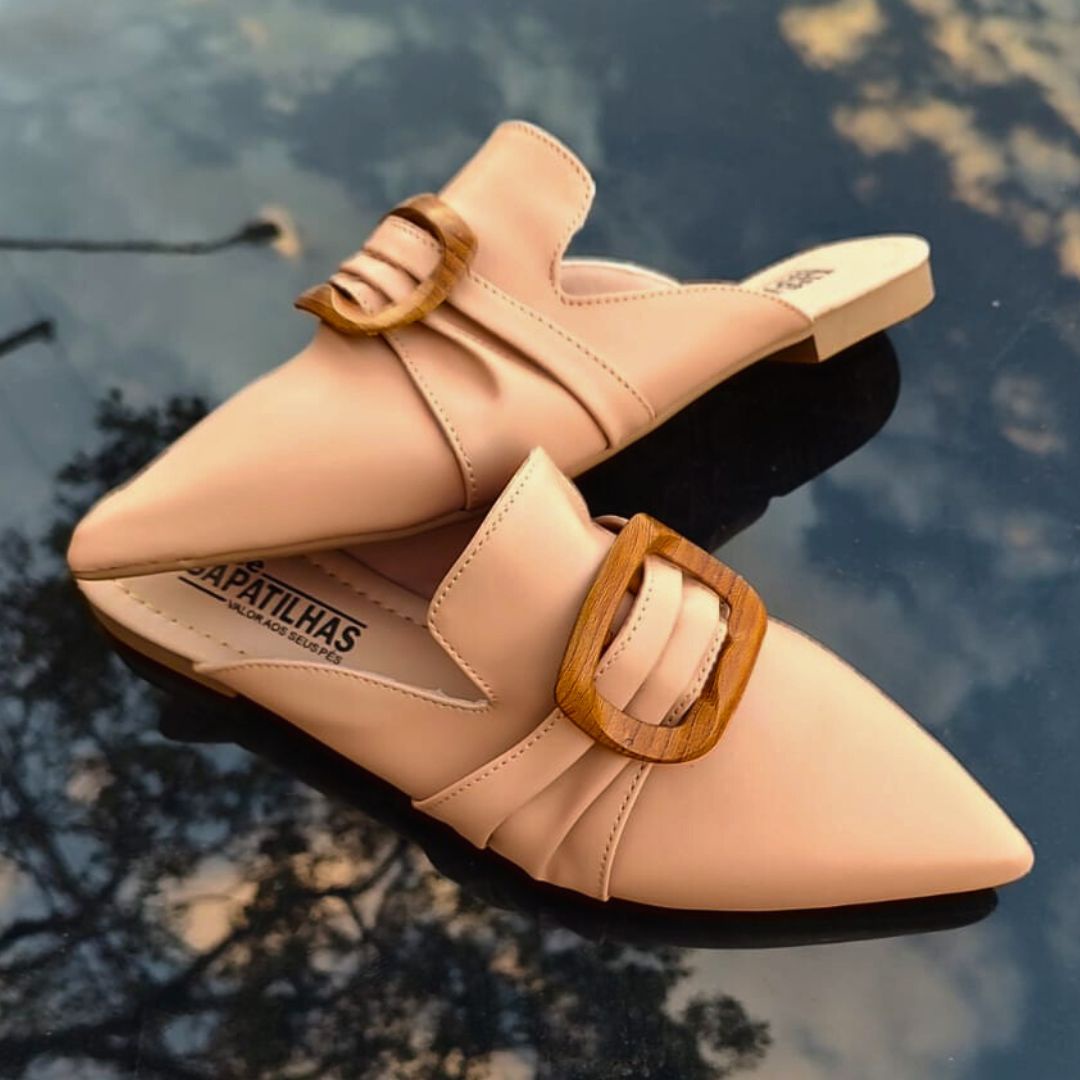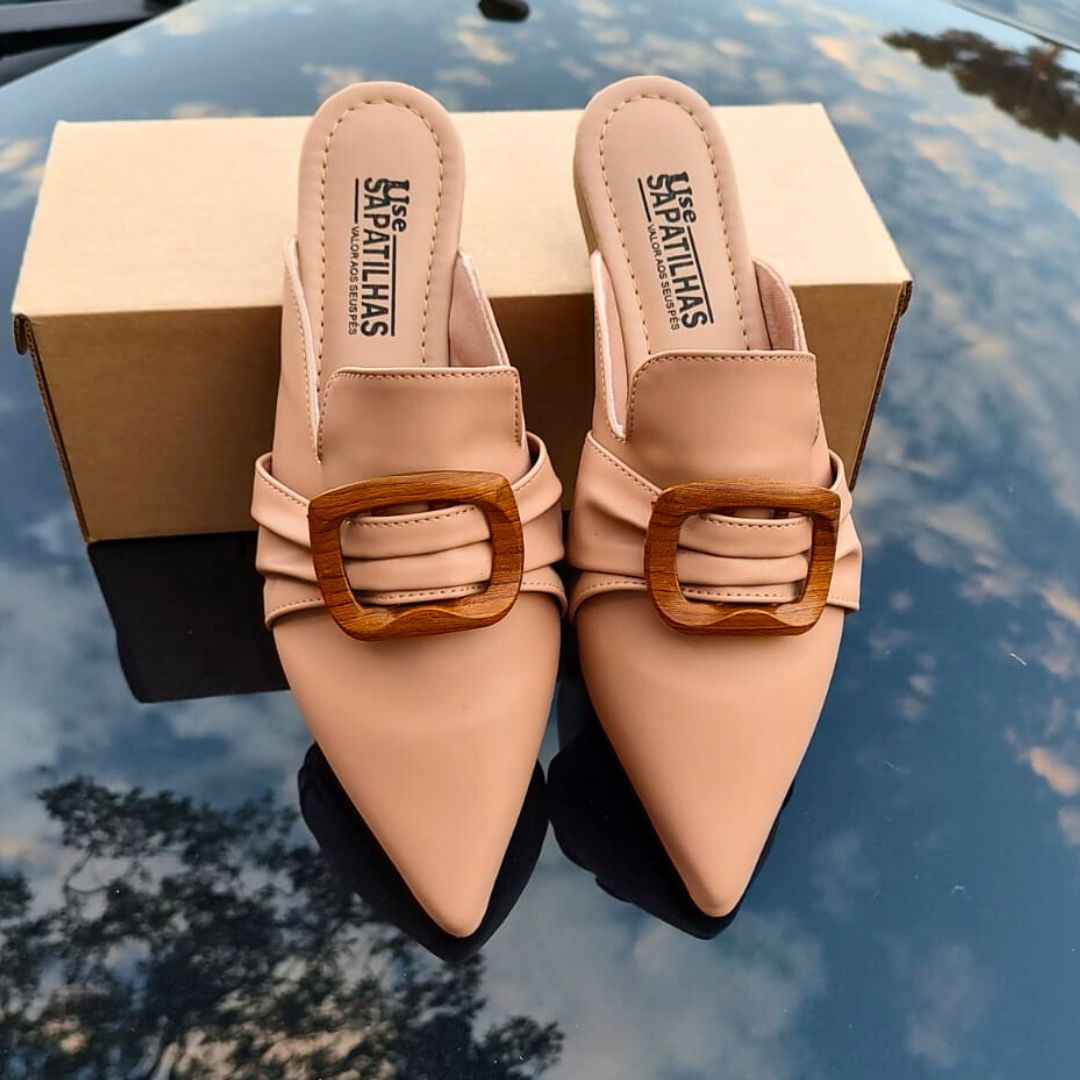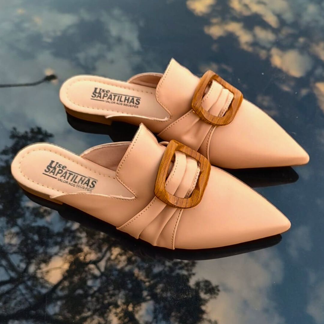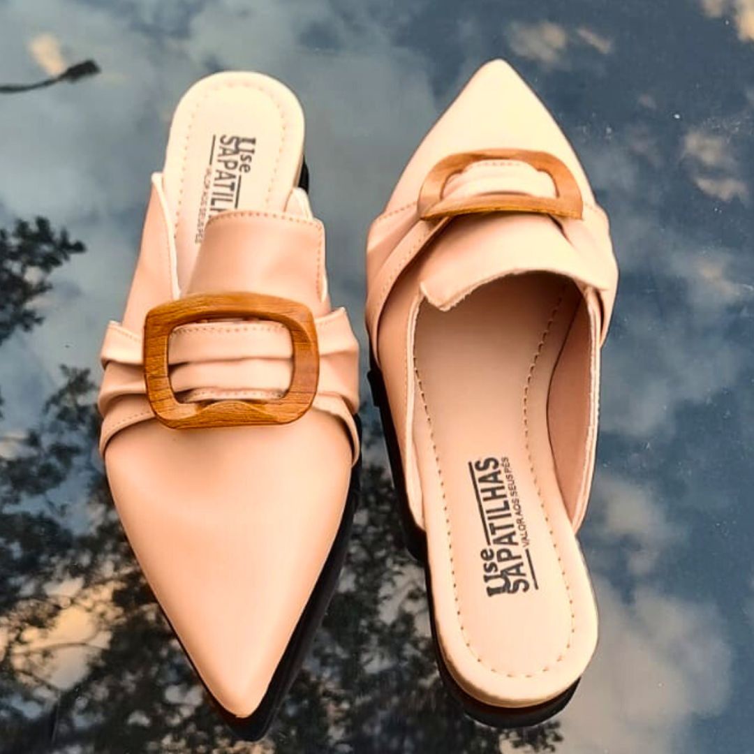 Mule de bico fino alongado na cor nude, um modelo elegante e moderno que se destaca pelo design contemporâneo.