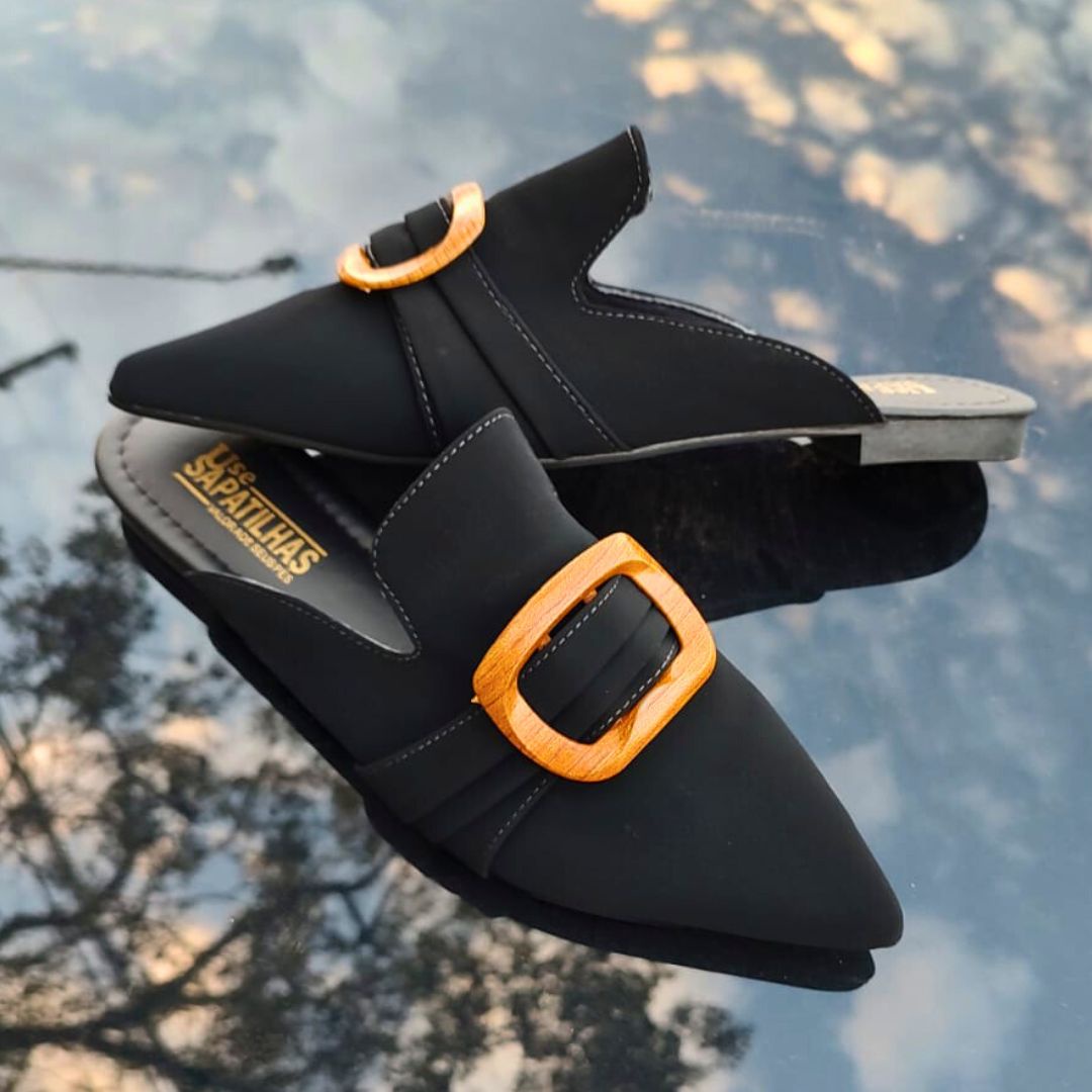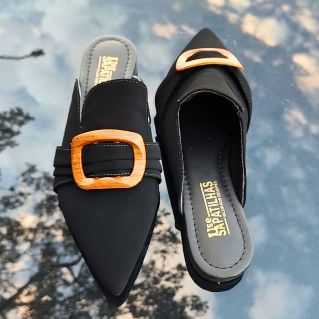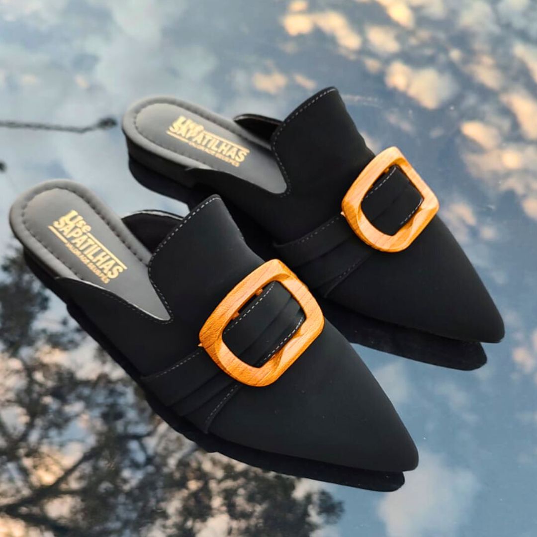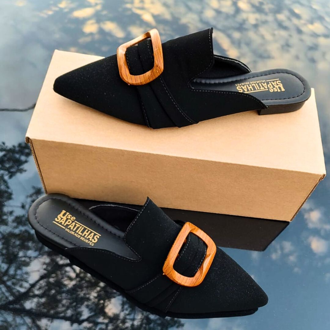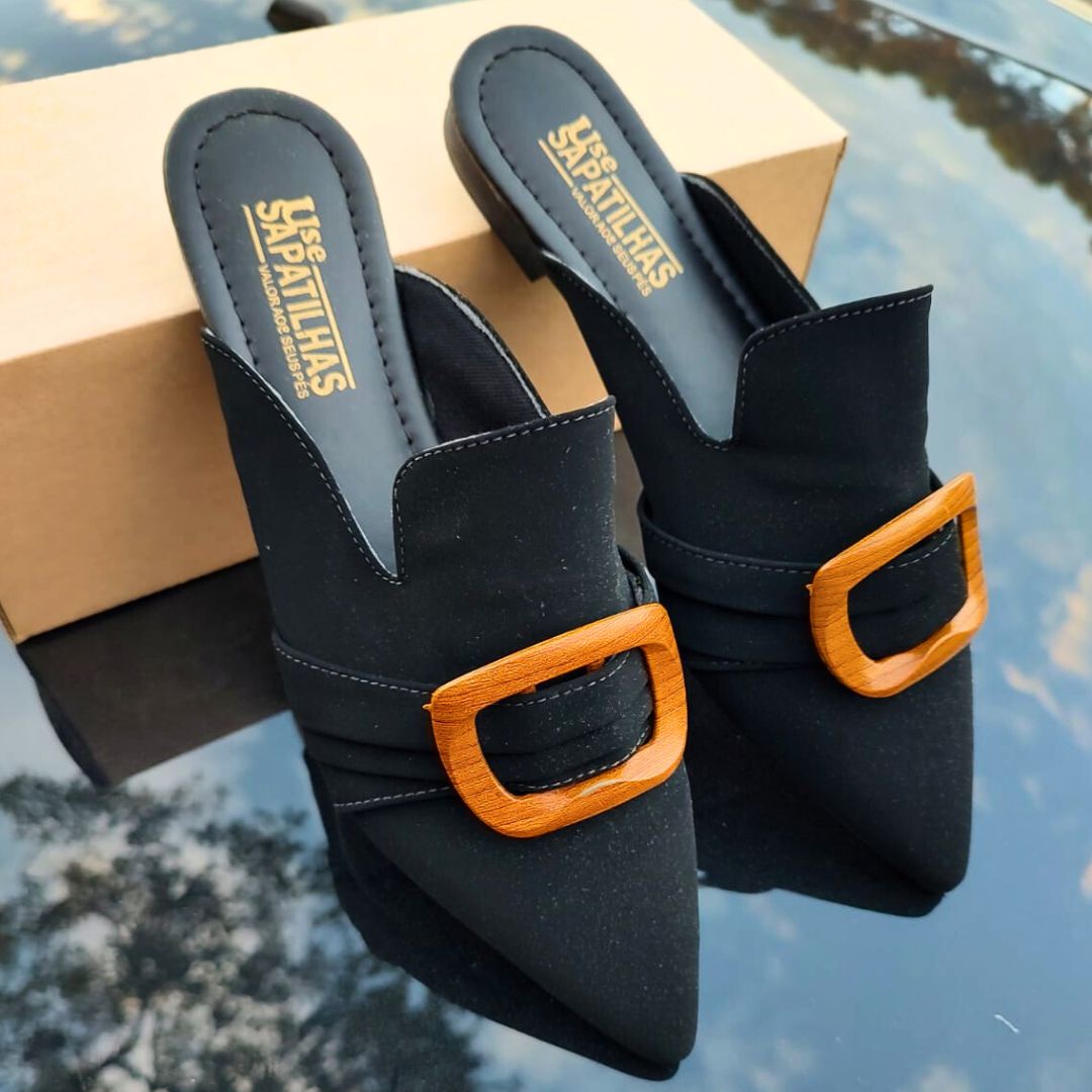 Mule de bico fino alongado na cor preta e material nobuck, um modelo elegante e moderno que se destaca pelo design contemporâneo.