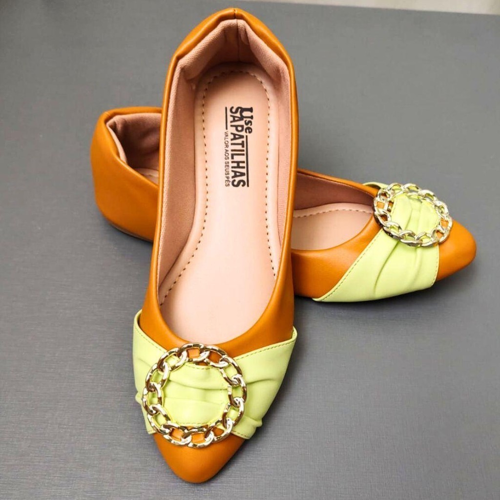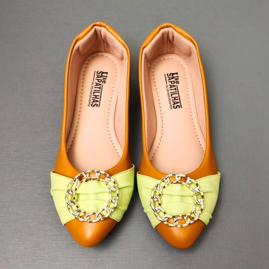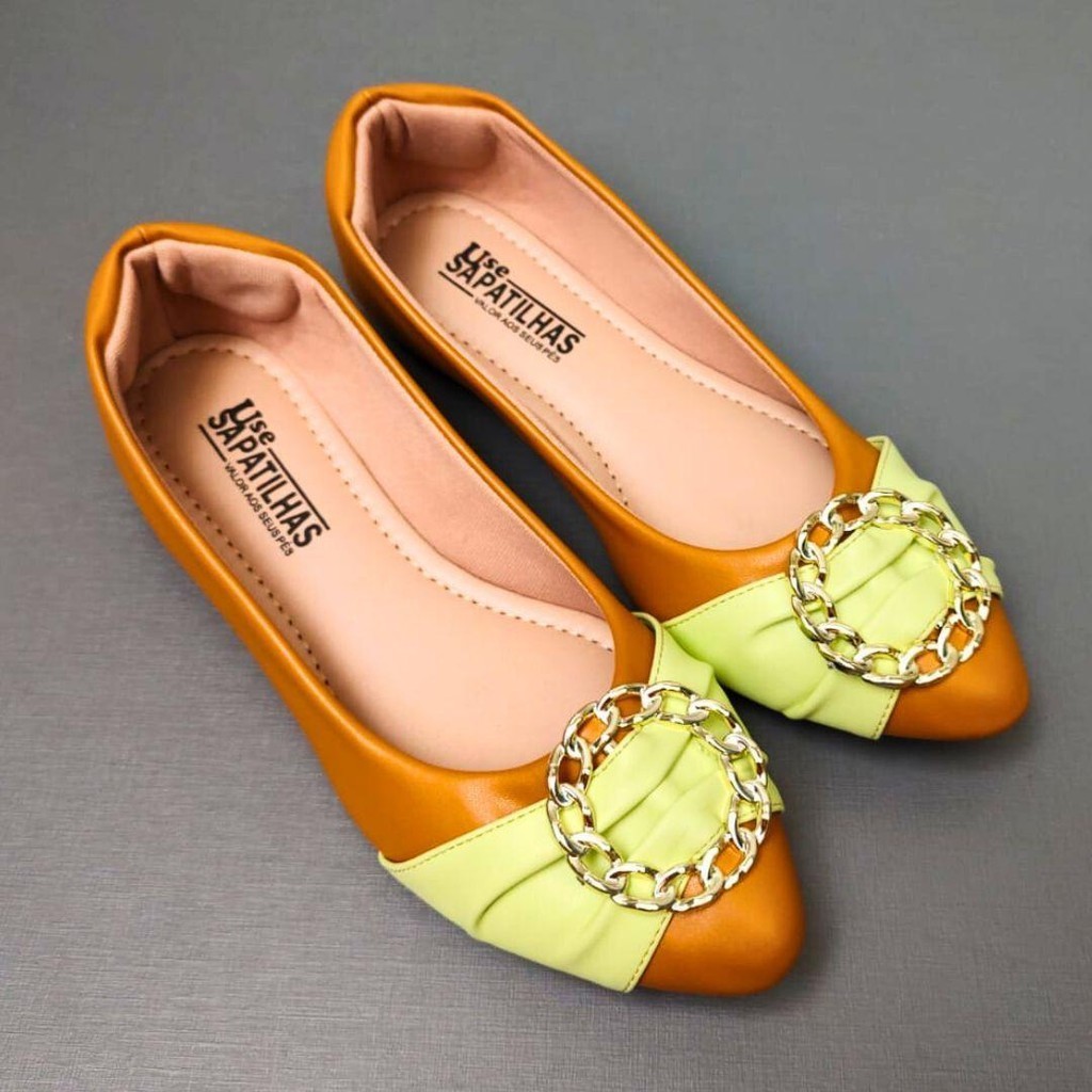 Sapatilha bico fino na exuberante cor mostarda, com um laço em verde água e detalhe dourado que realça sua elegância e vivacidade.