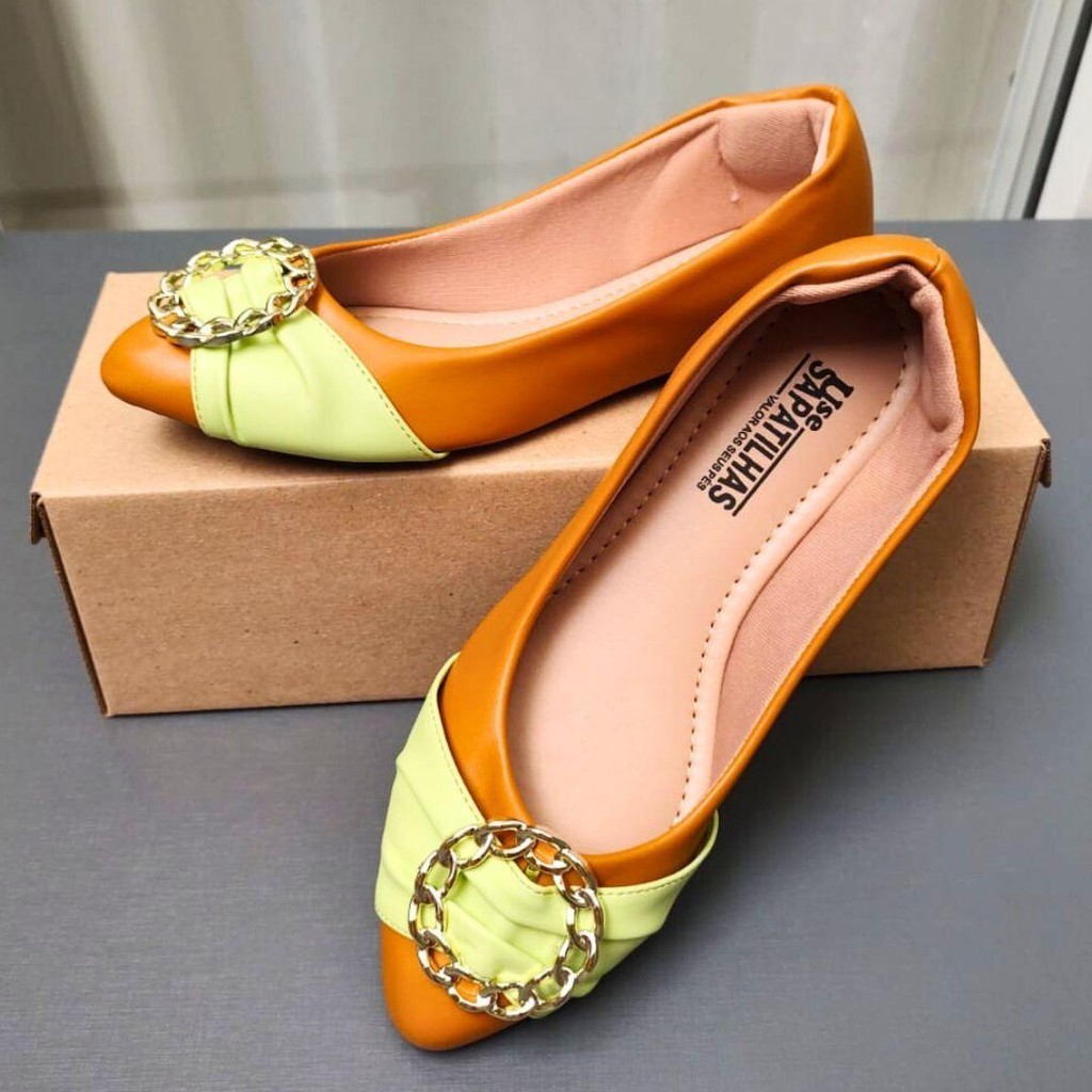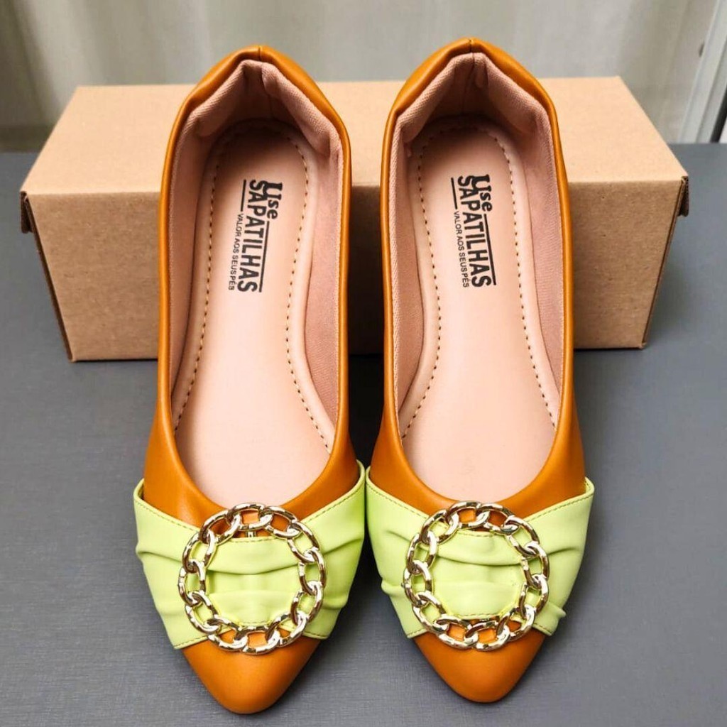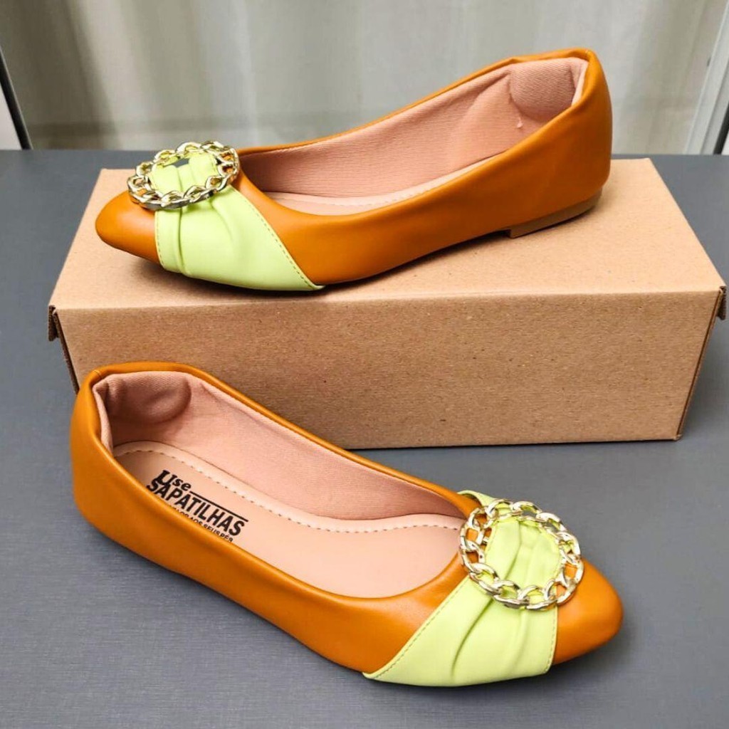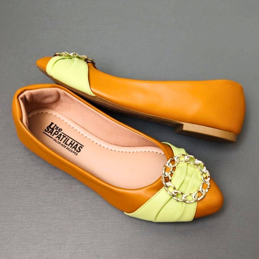 Sapatilha bico fino na exuberante cor mostarda, com um laço em verde água e detalhe dourado que realça sua elegância e vivacidade.