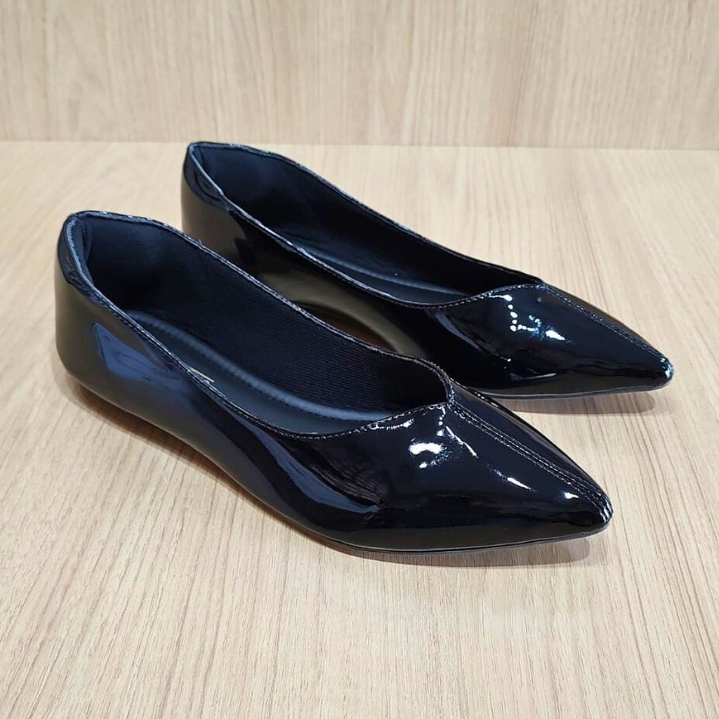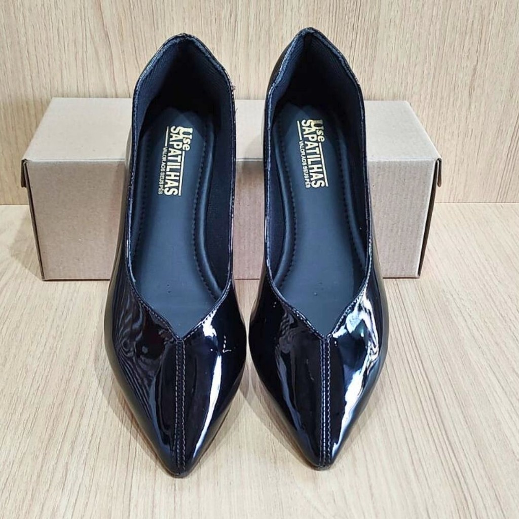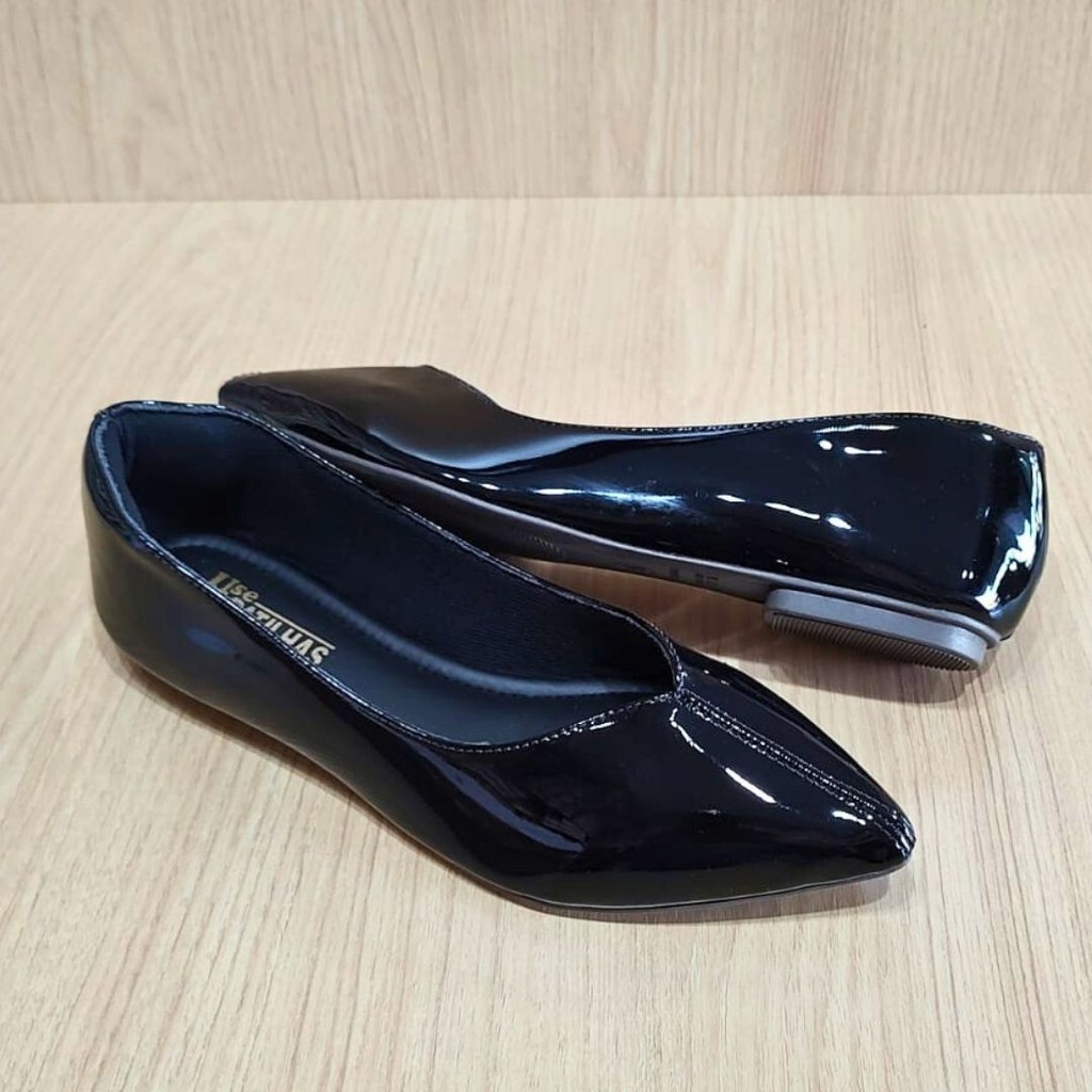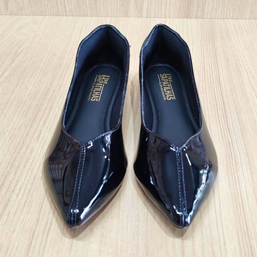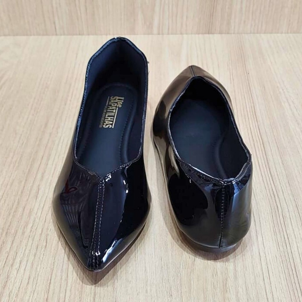Sapatilha preta com verniz e bico fino, perfeita para adicionar elegância ao seu visual.
